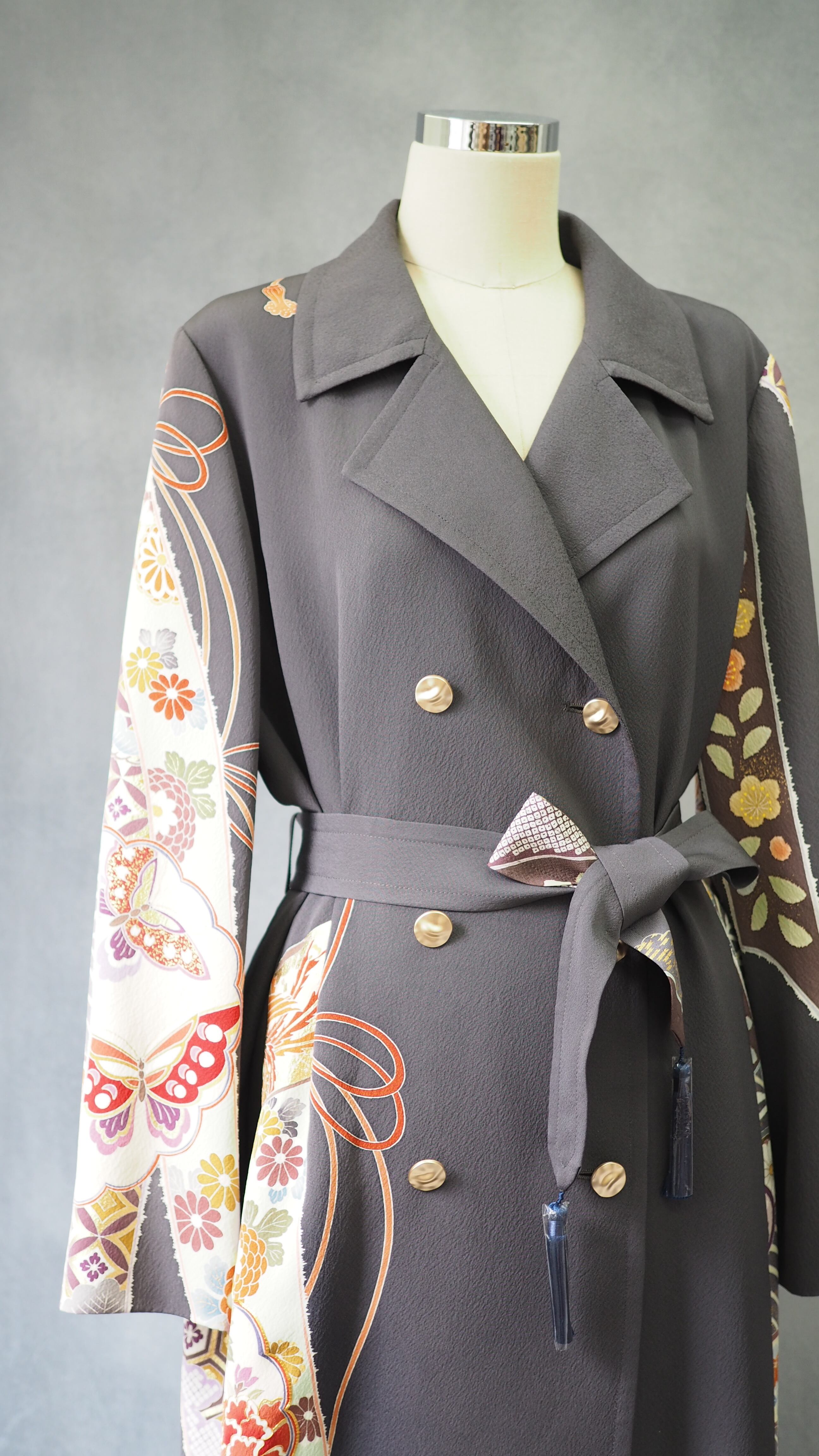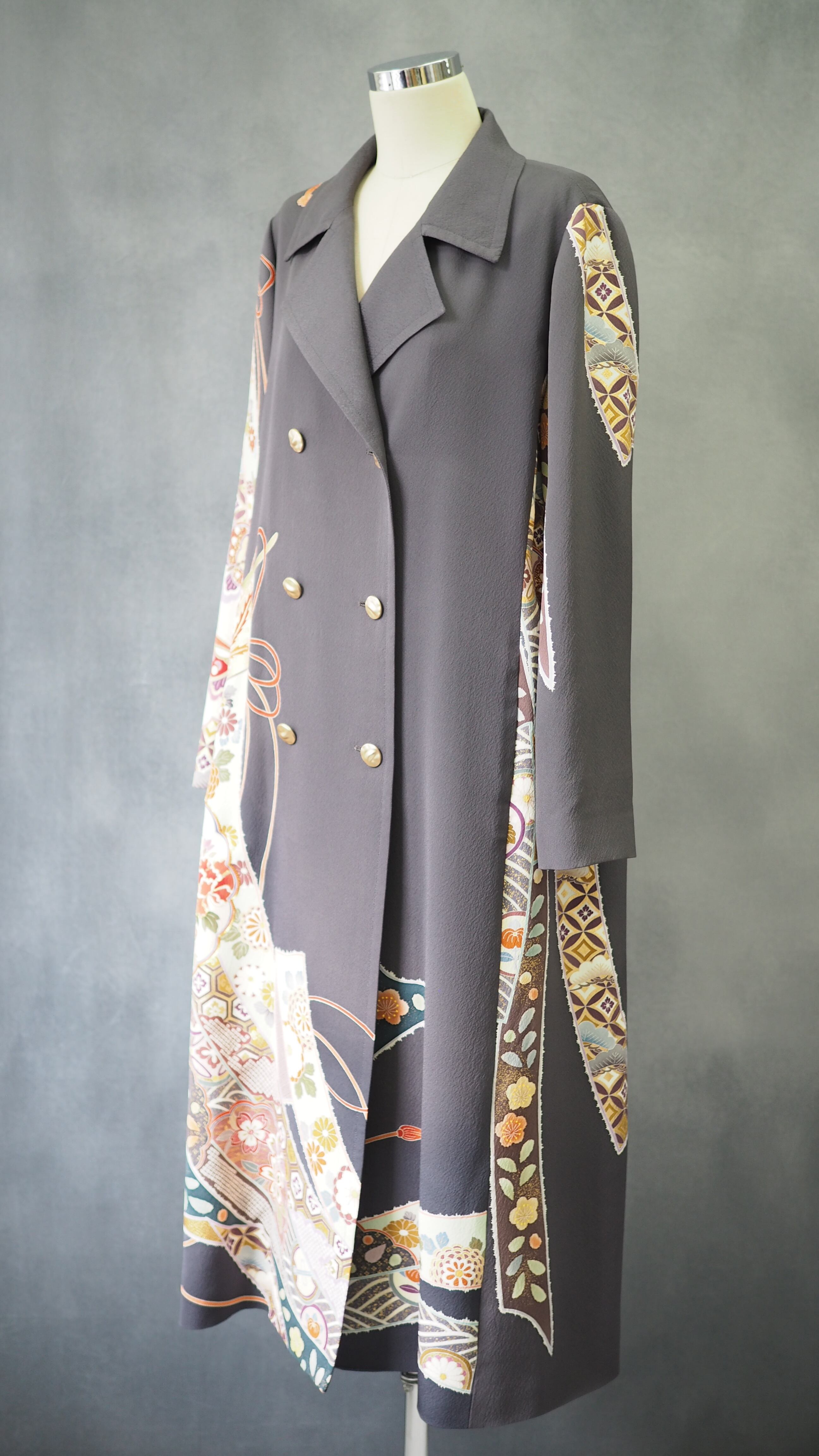 格式高いダブルブレストデザインで、着物の美しい柄が際立つエレガントなロングコート。