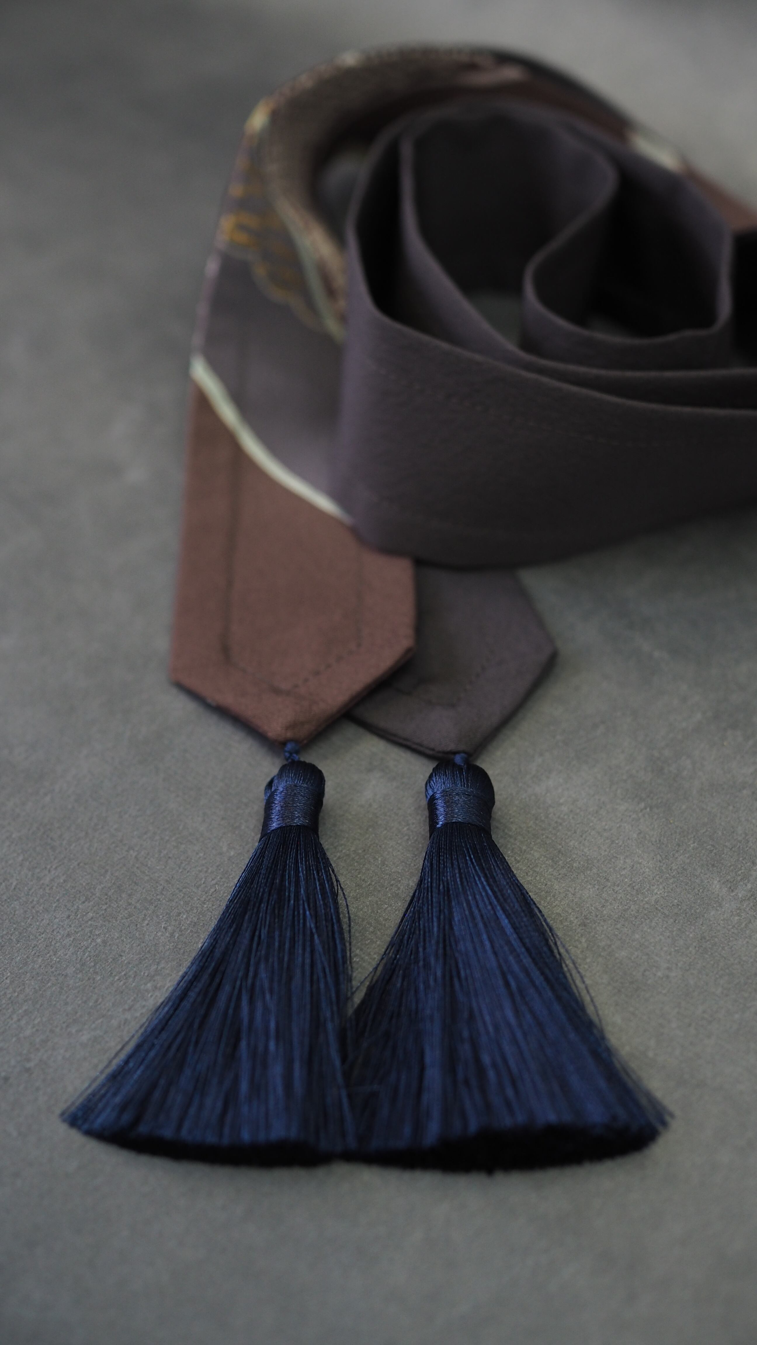Delicate coral-orange obijime cords accent the composition, tied with traditional tassels that add subtle movement and warmth to the cooler palette.