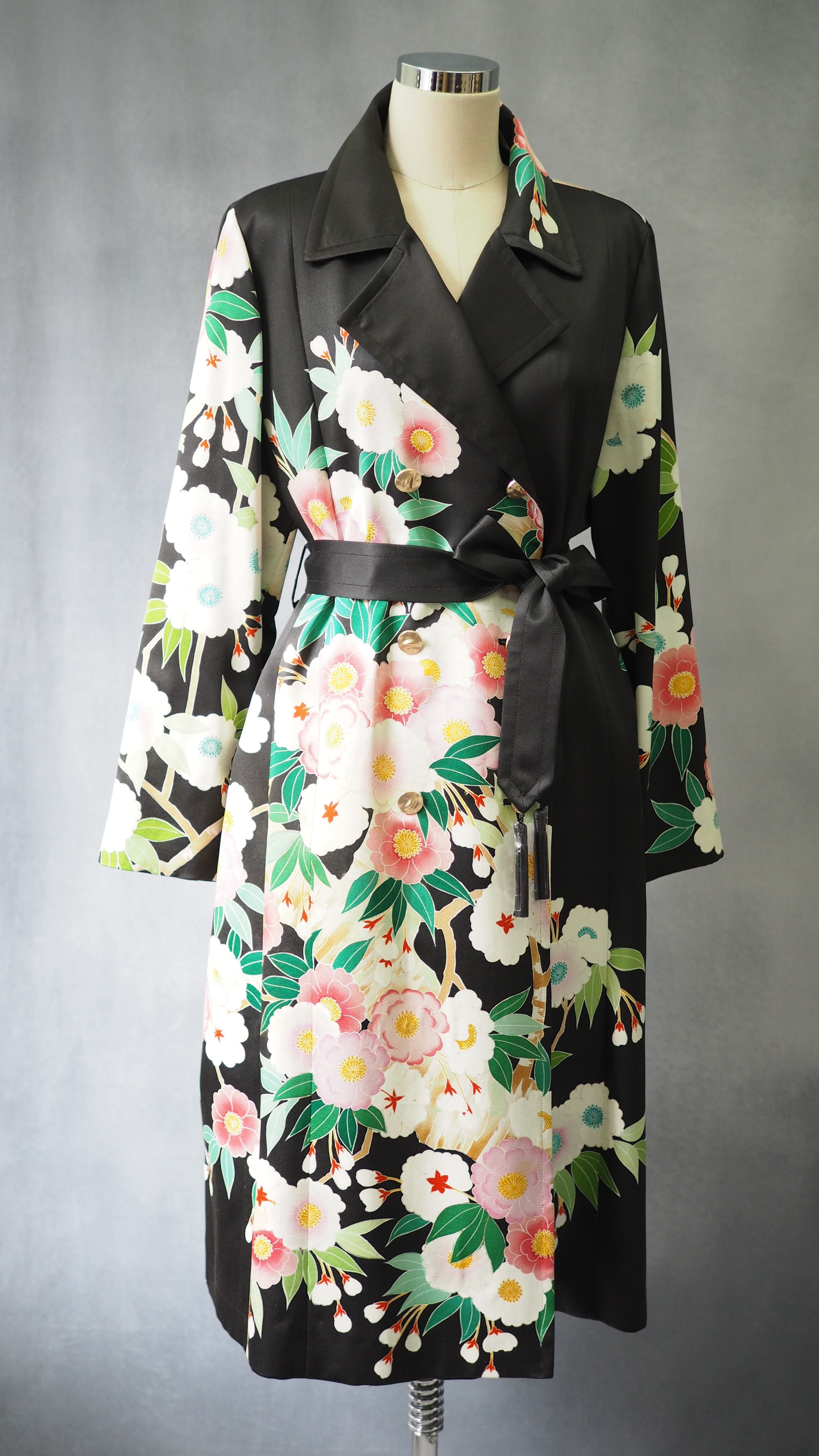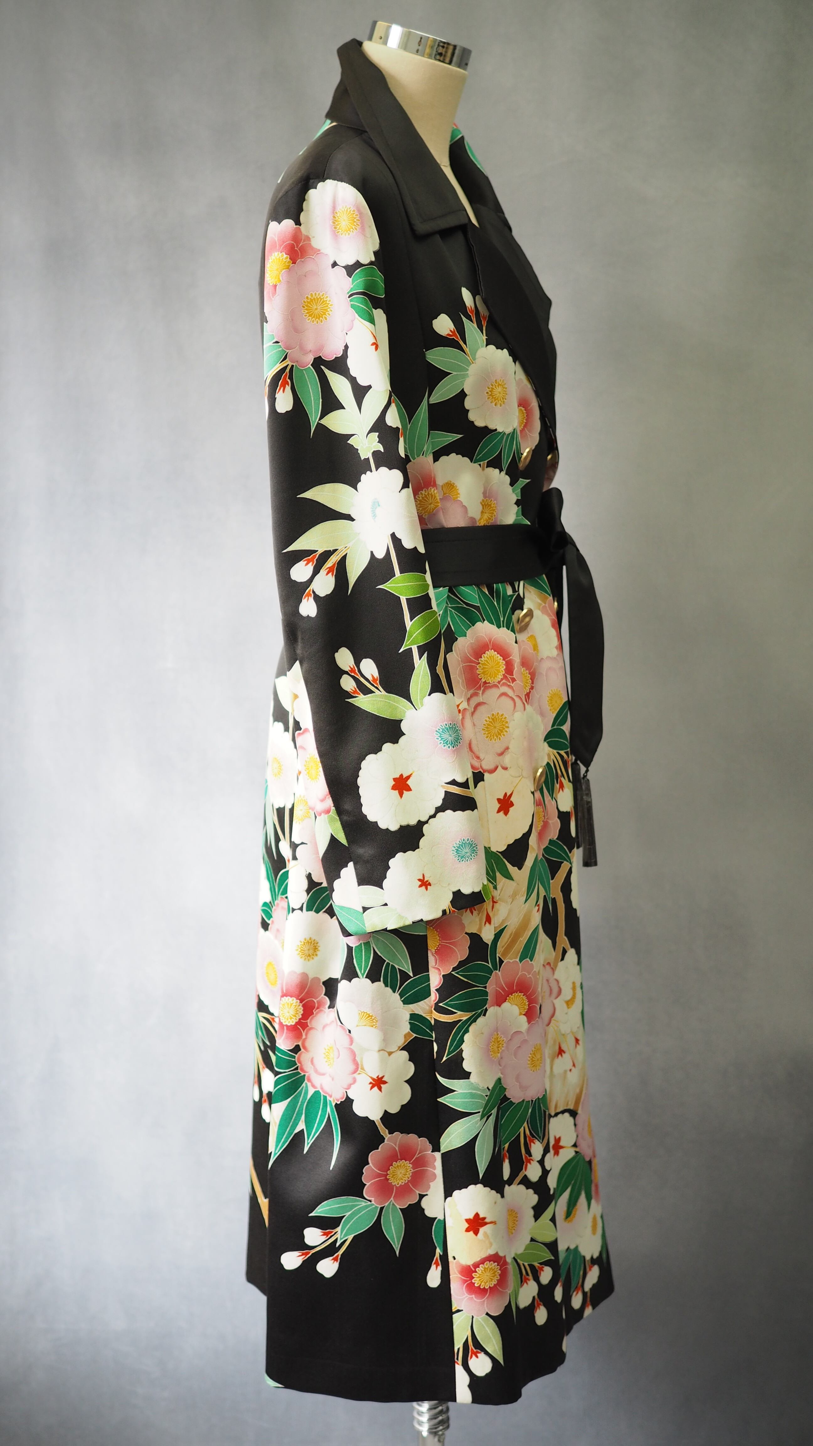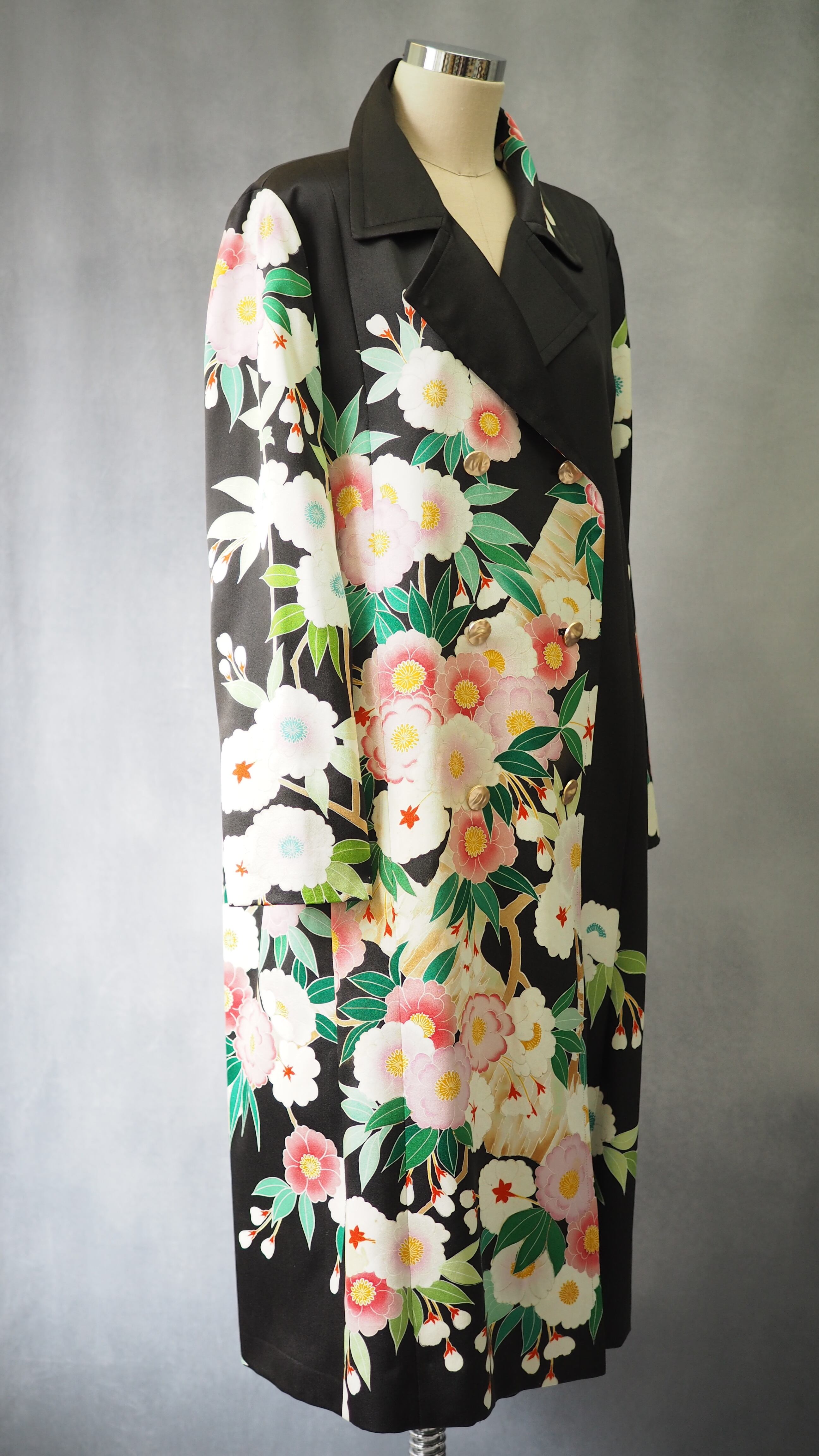 格式高いダブルブレストデザインで、着物の美しい柄が際立つエレガントなロングコート。