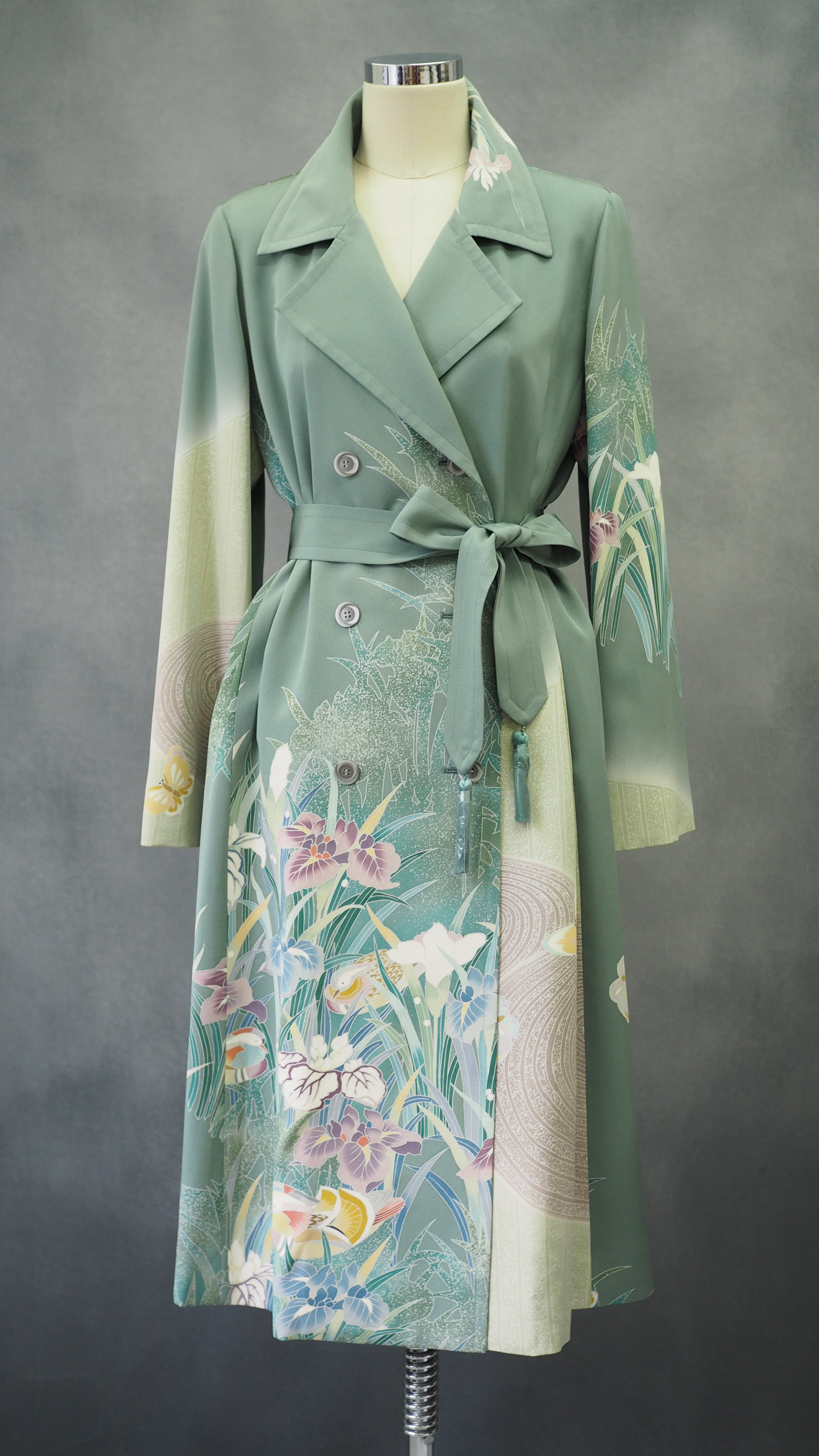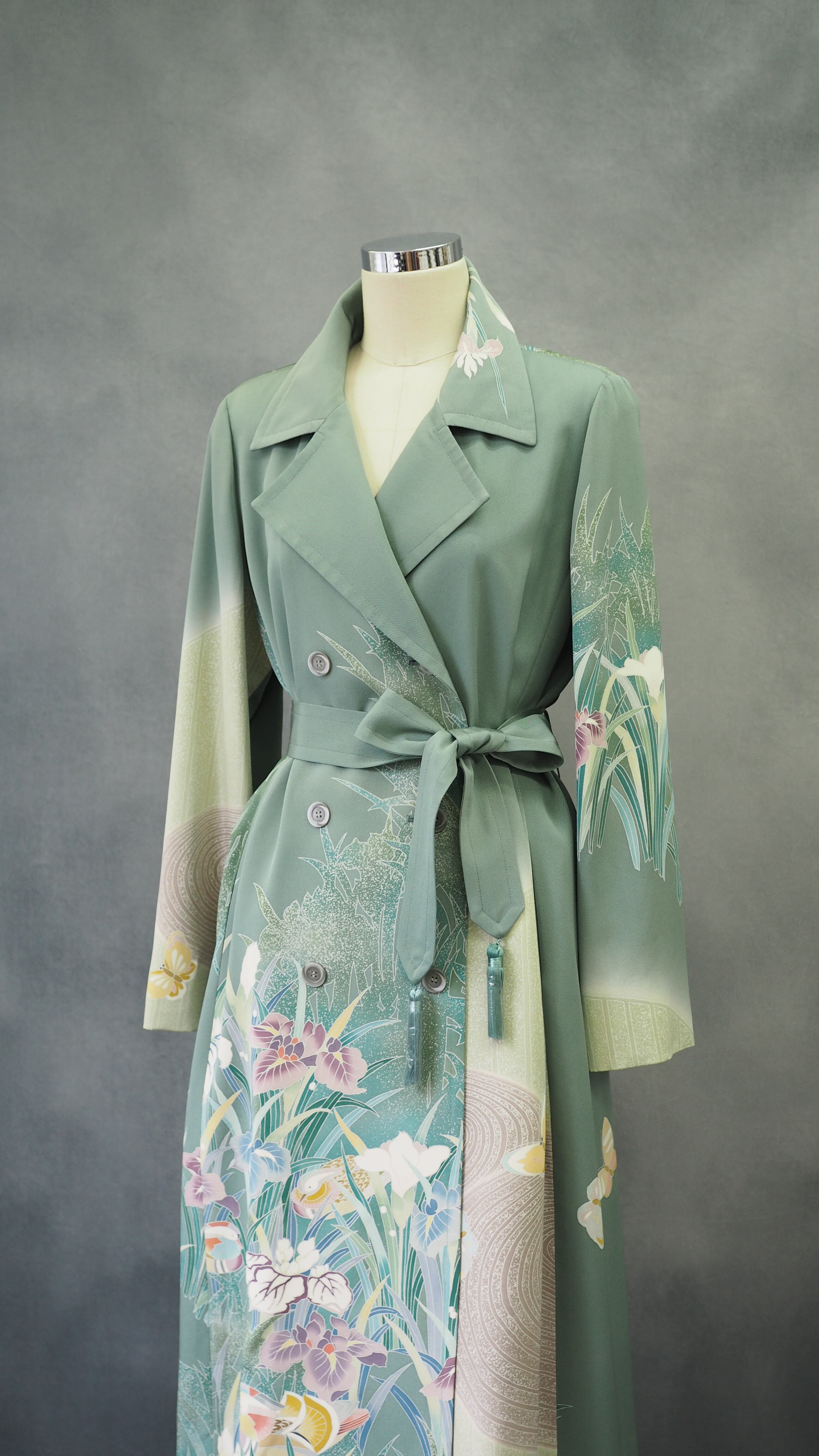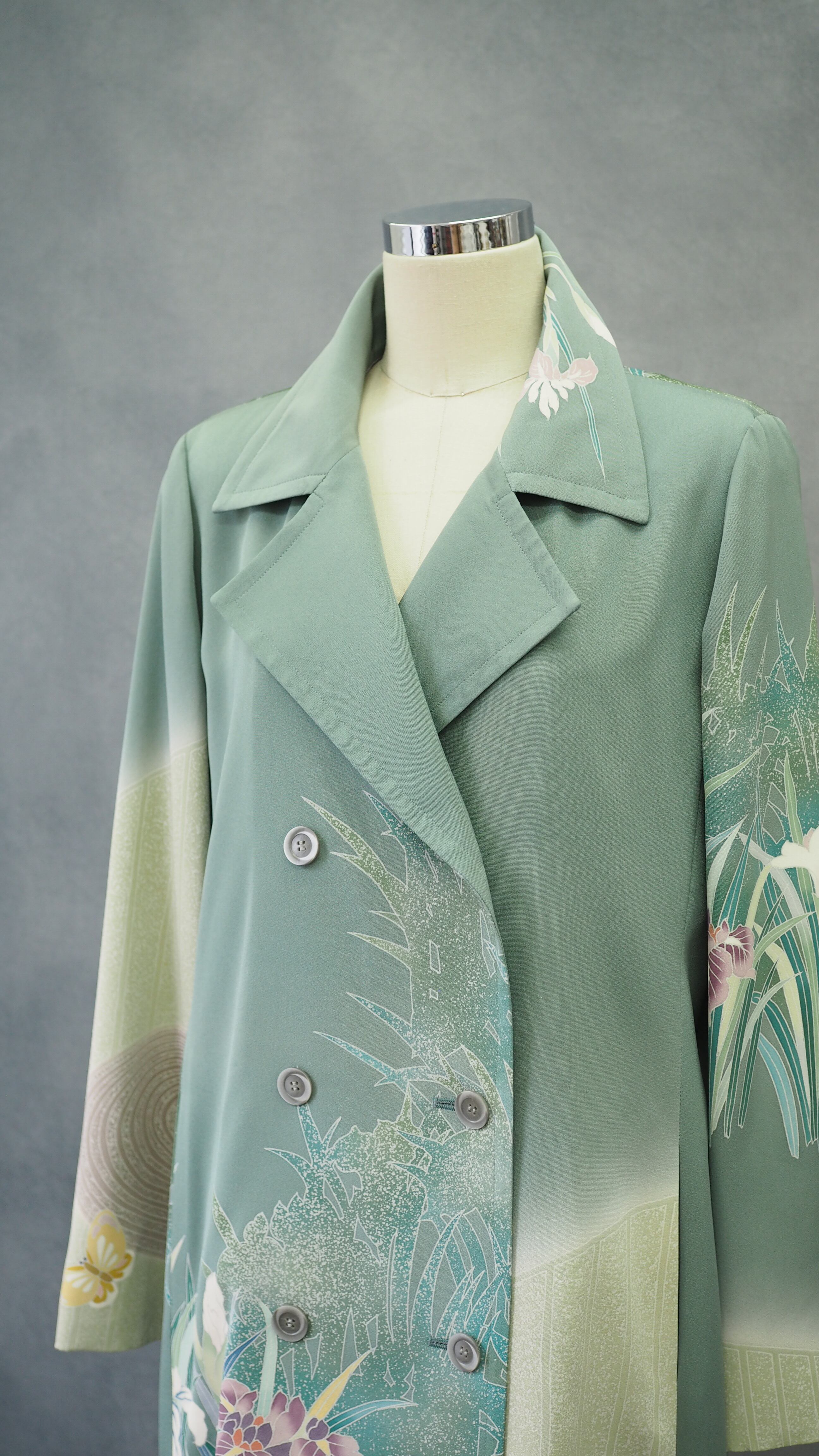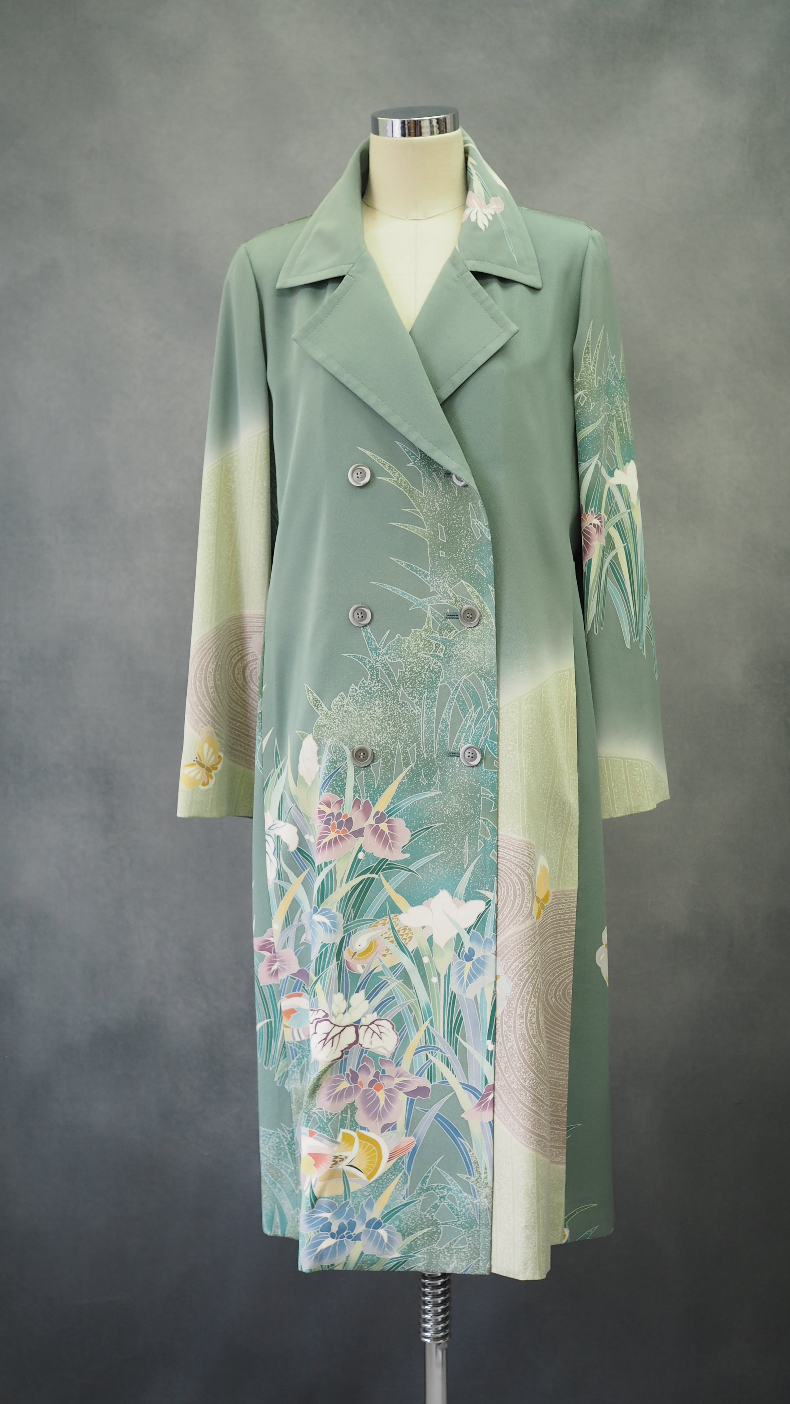 格式高いダブルブレストデザインで、着物の美しい柄が際立つエレガントなロングコート。