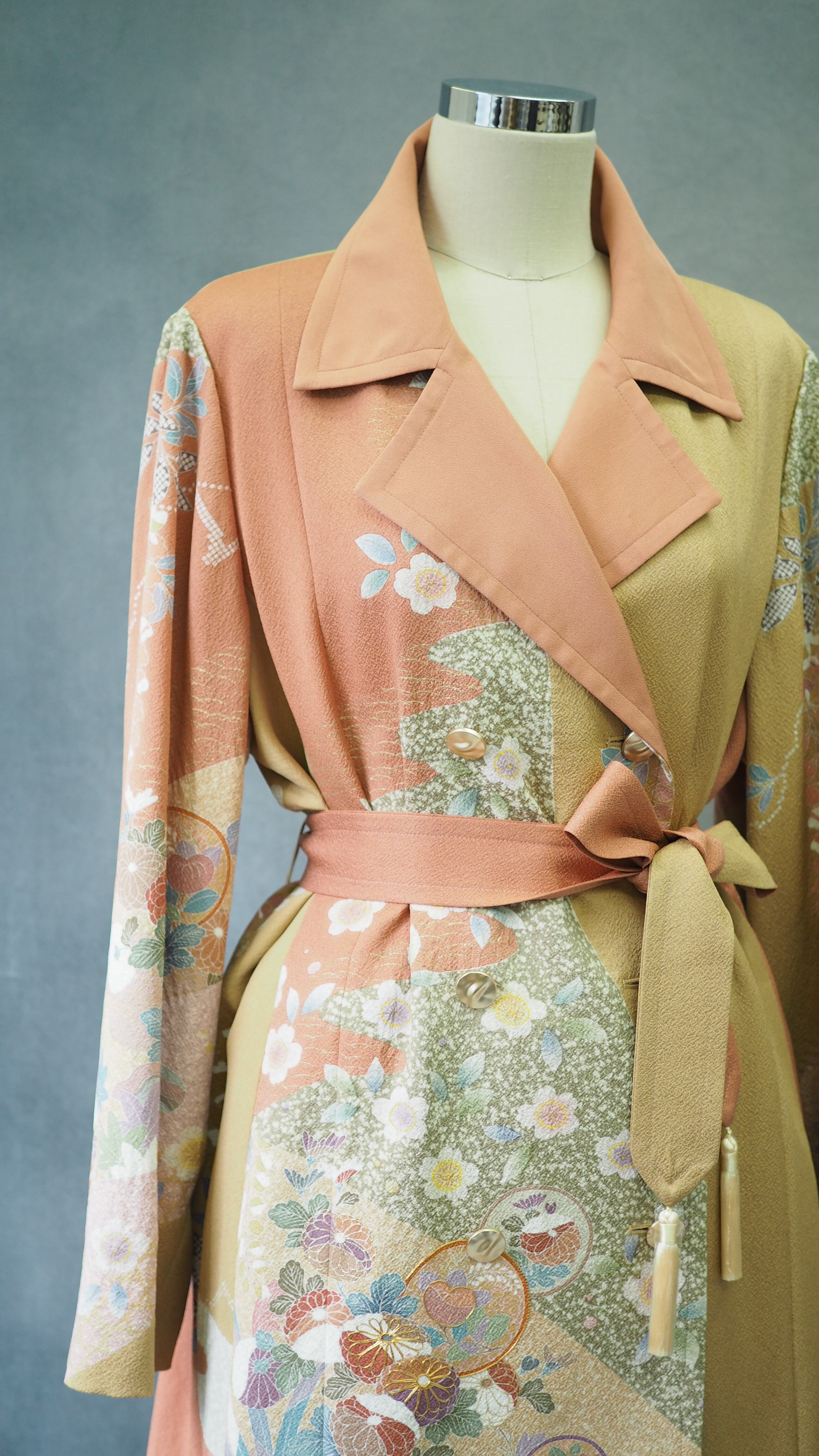 着物の絹を現代的なアウターウェアへと昇華させる、洗練されたダブルブレストデザイン。