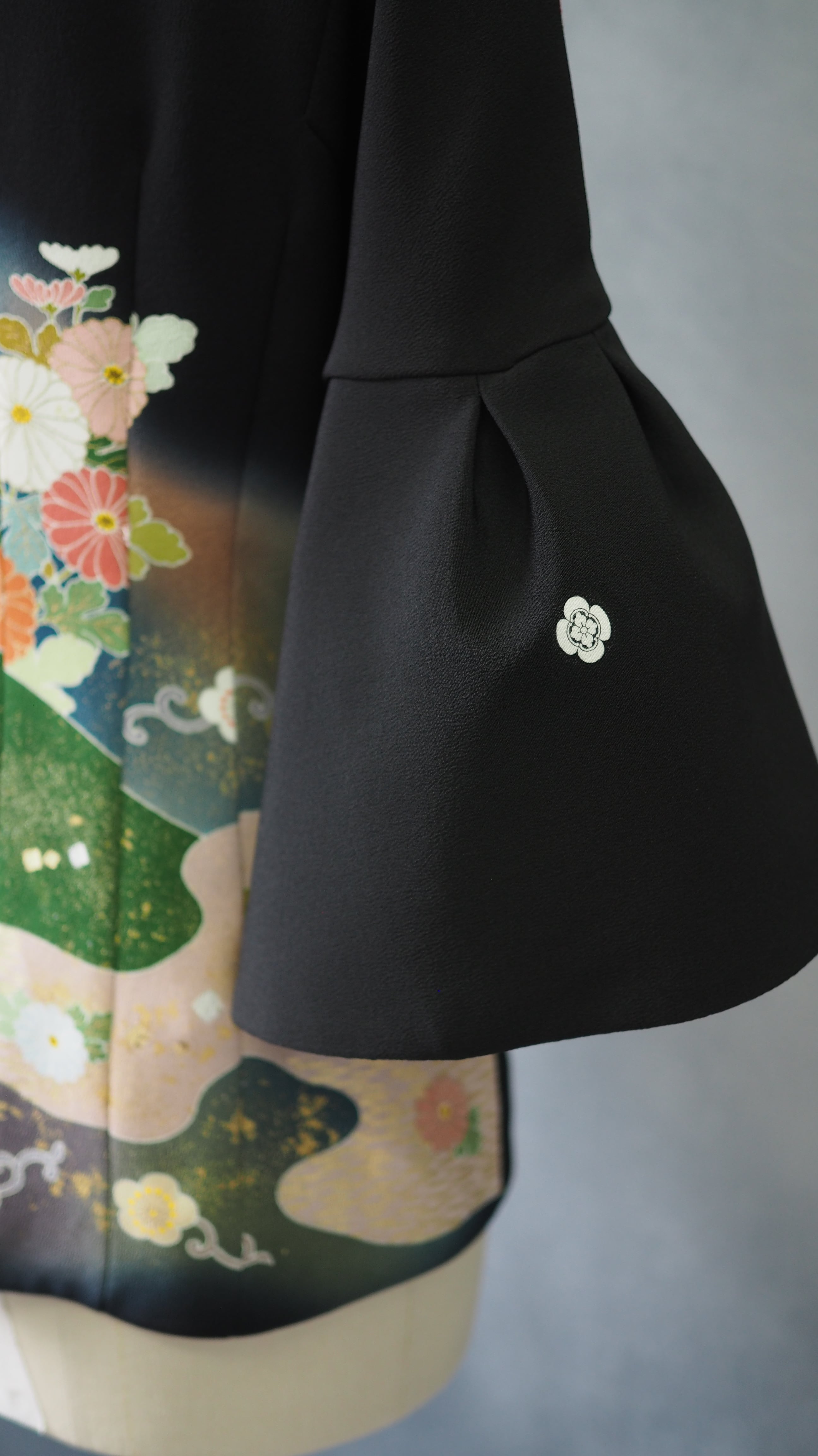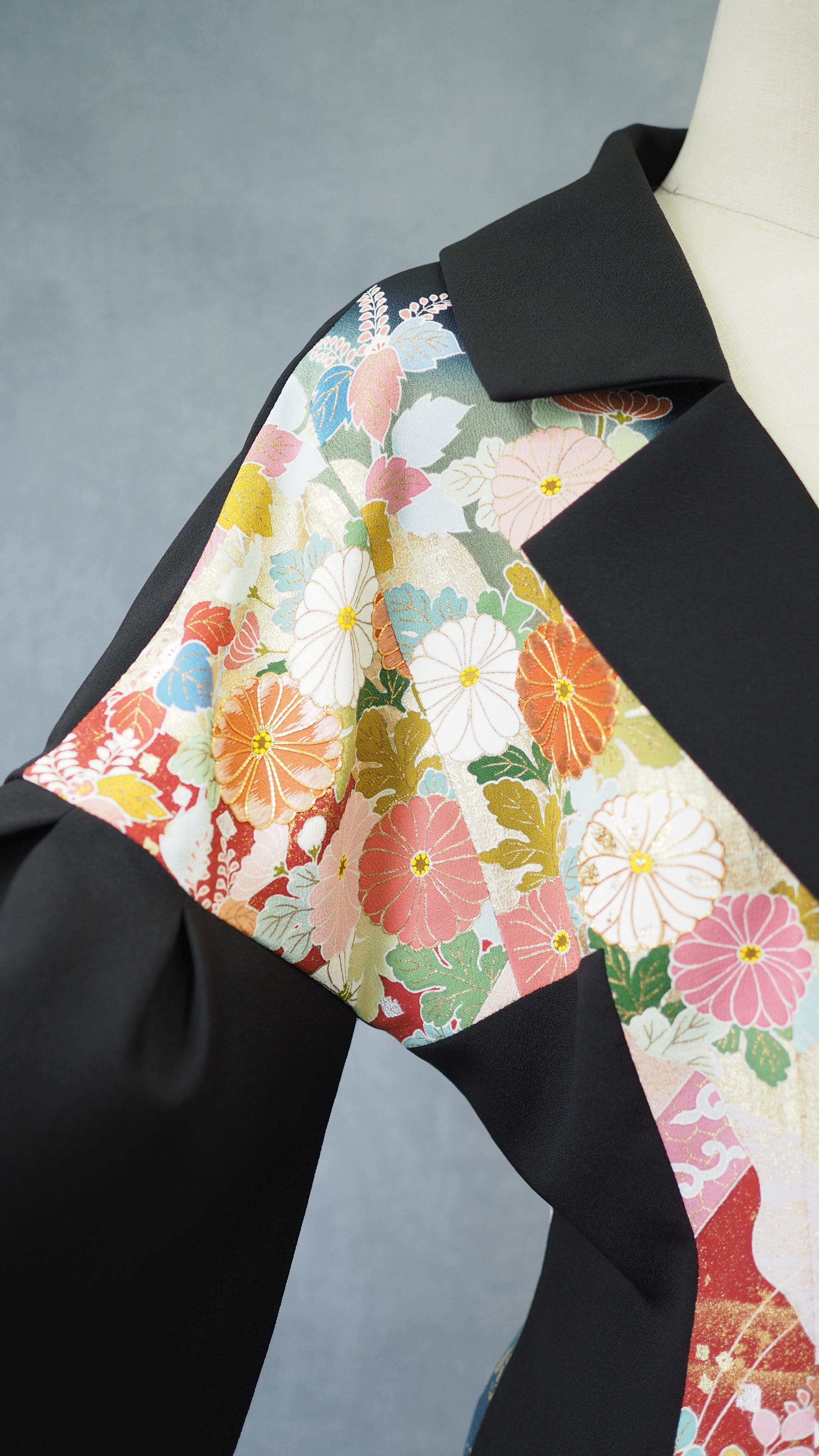 着物の美しい柄は前後の見頃にドラマティックに配置され、袖を広げた瞬間、まるで絵画のような佇まいに。