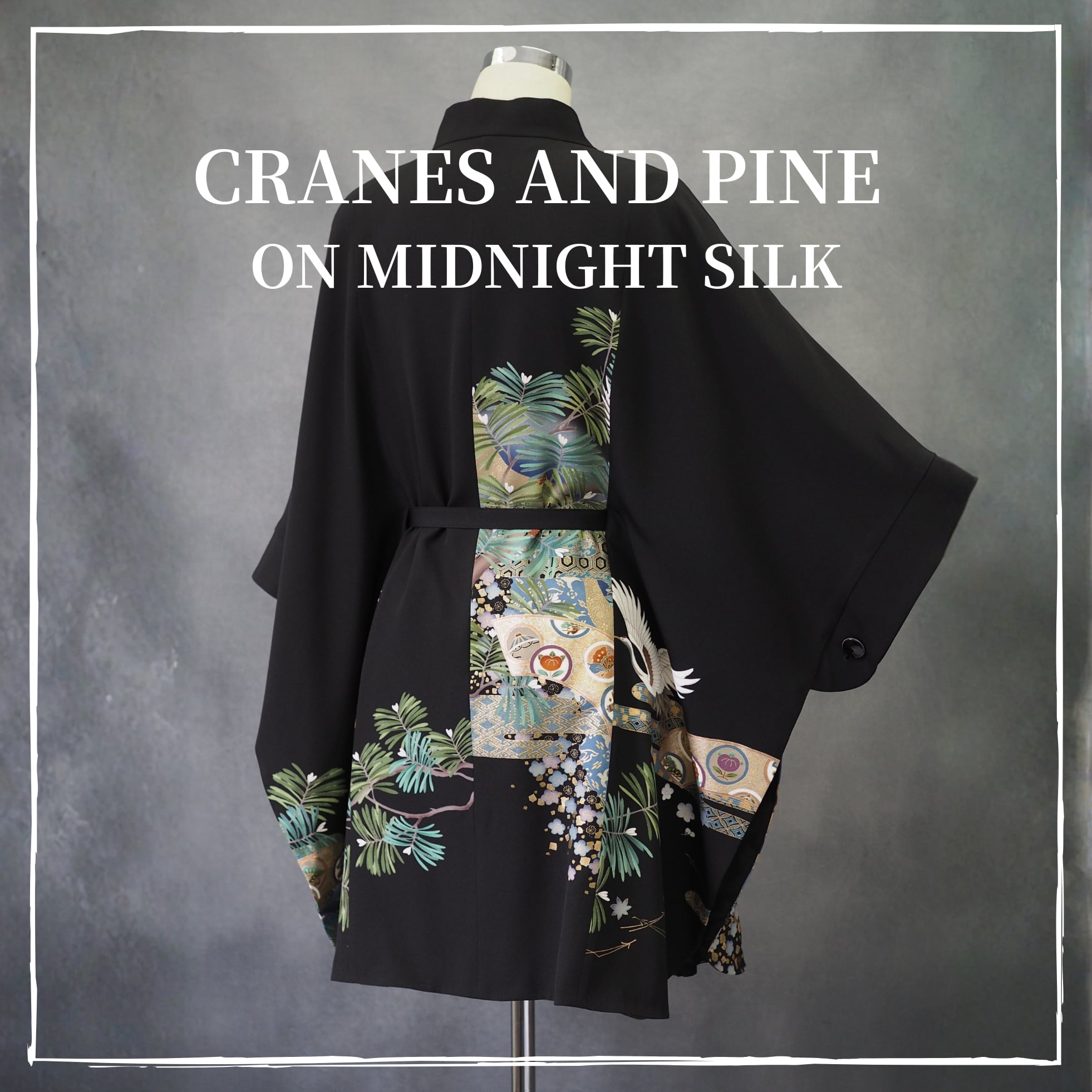 BLACK TOMESODE: CRANES AND PINE ON MIDNIGHT SILK