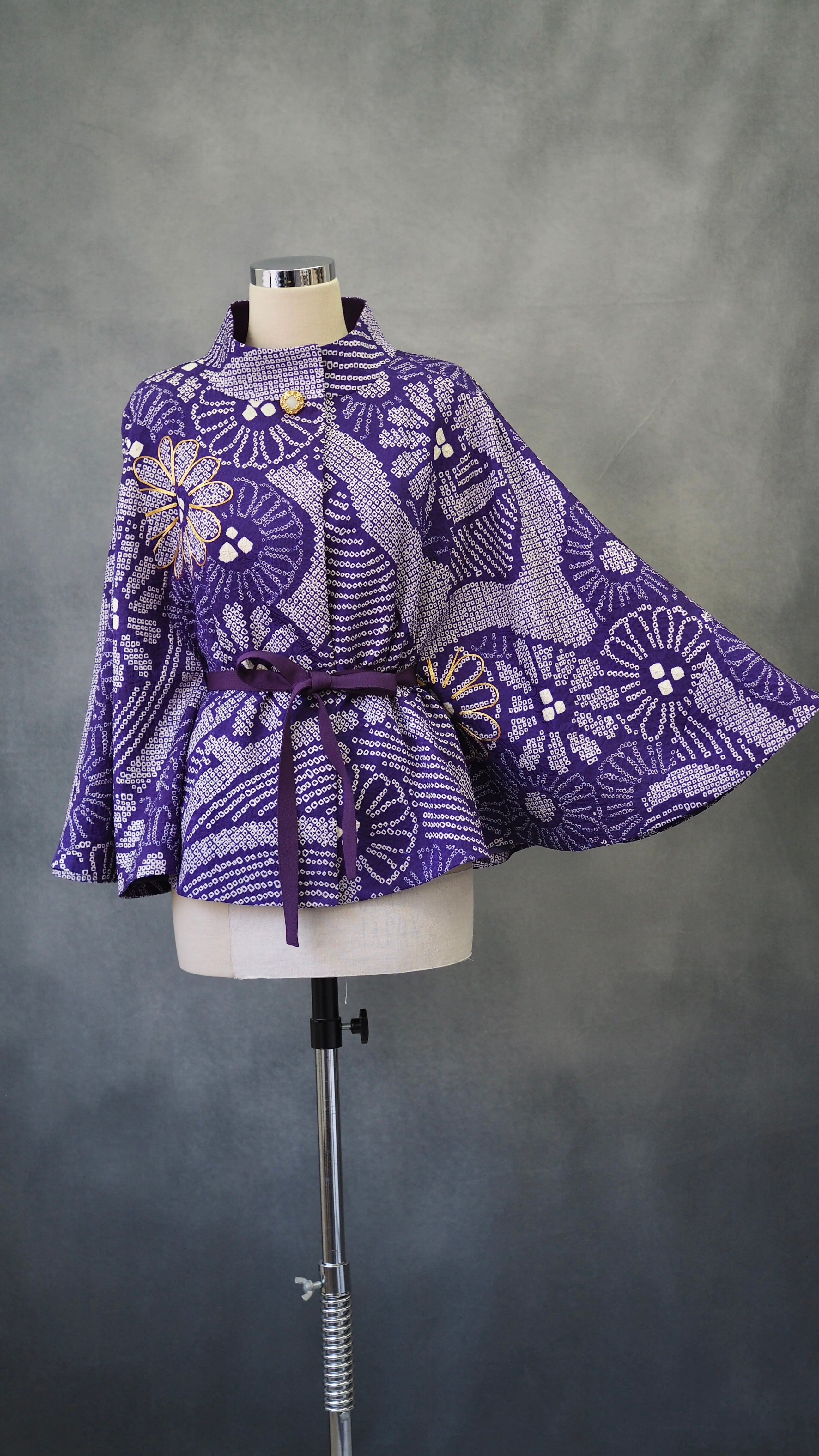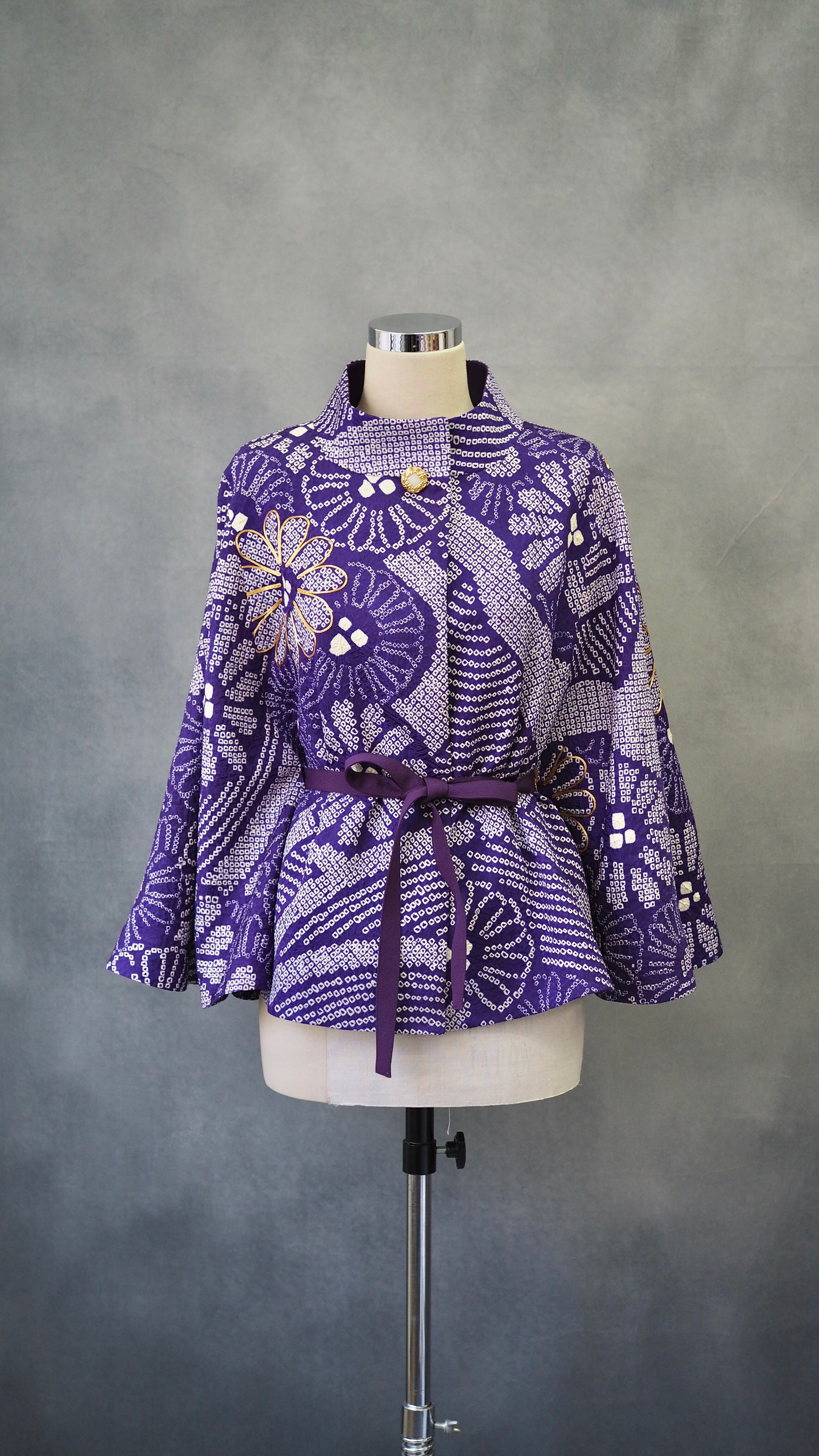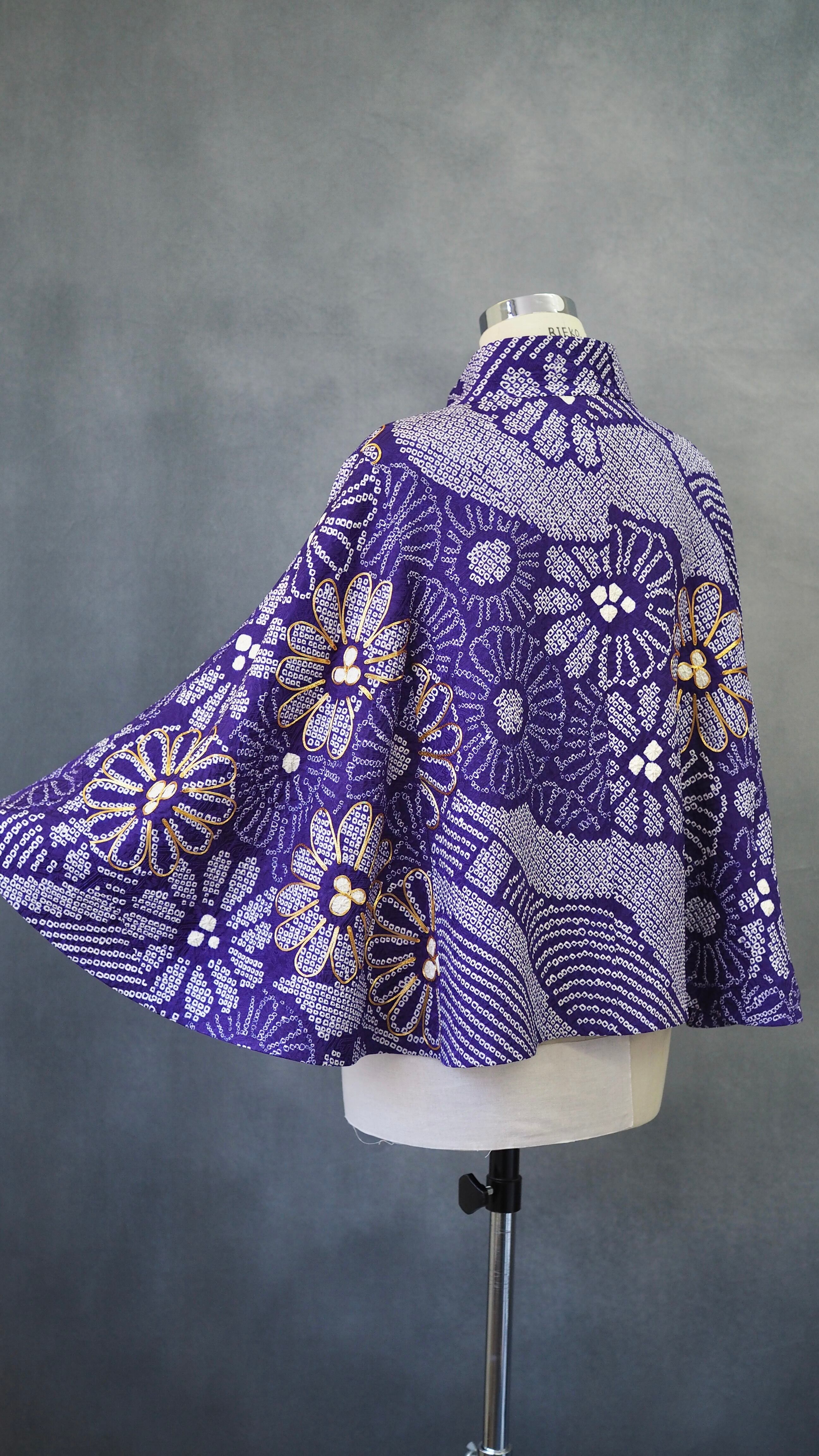 Against a vibrant imperial purple ground, the entire surface is adorned with shibori tie-dyed chrysanthemums and geometric patterns, each motif created through countless individual knots tied by hand before dyeing.