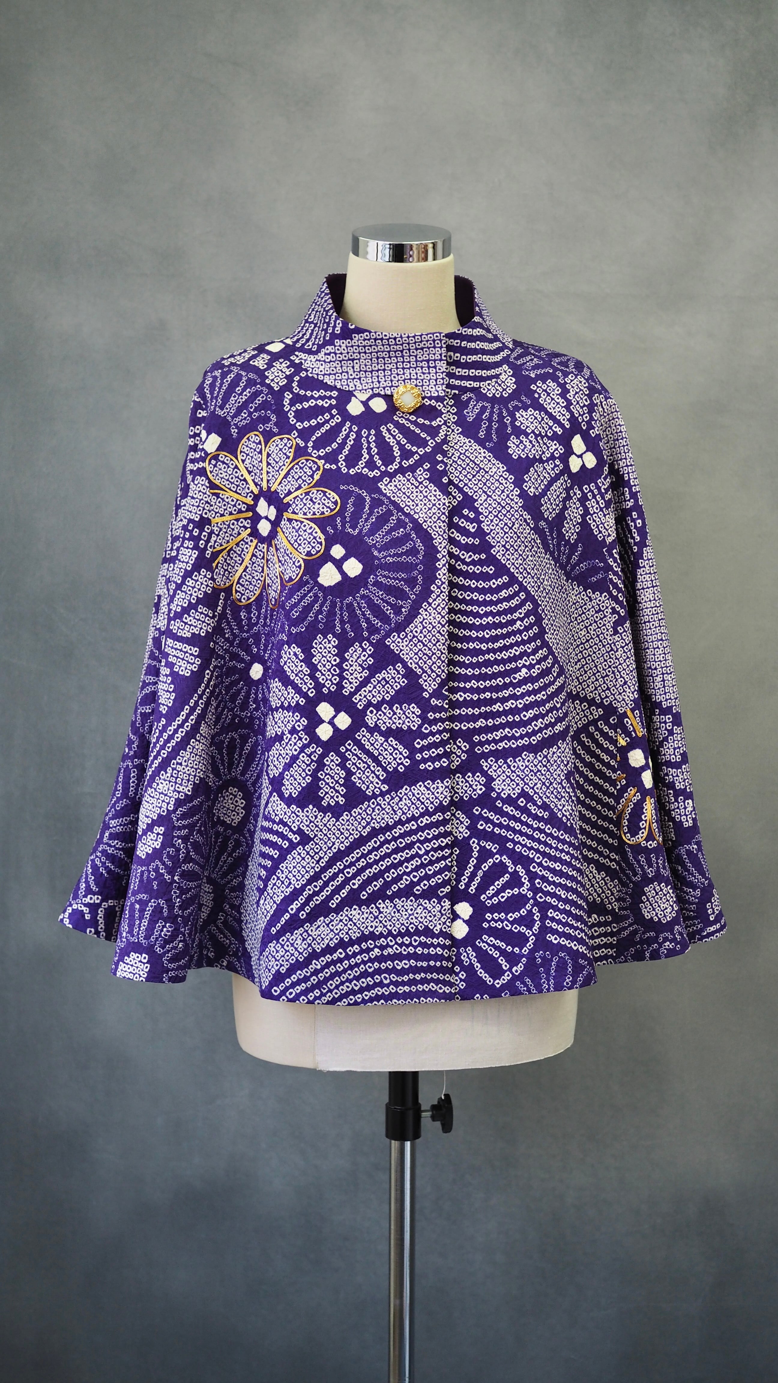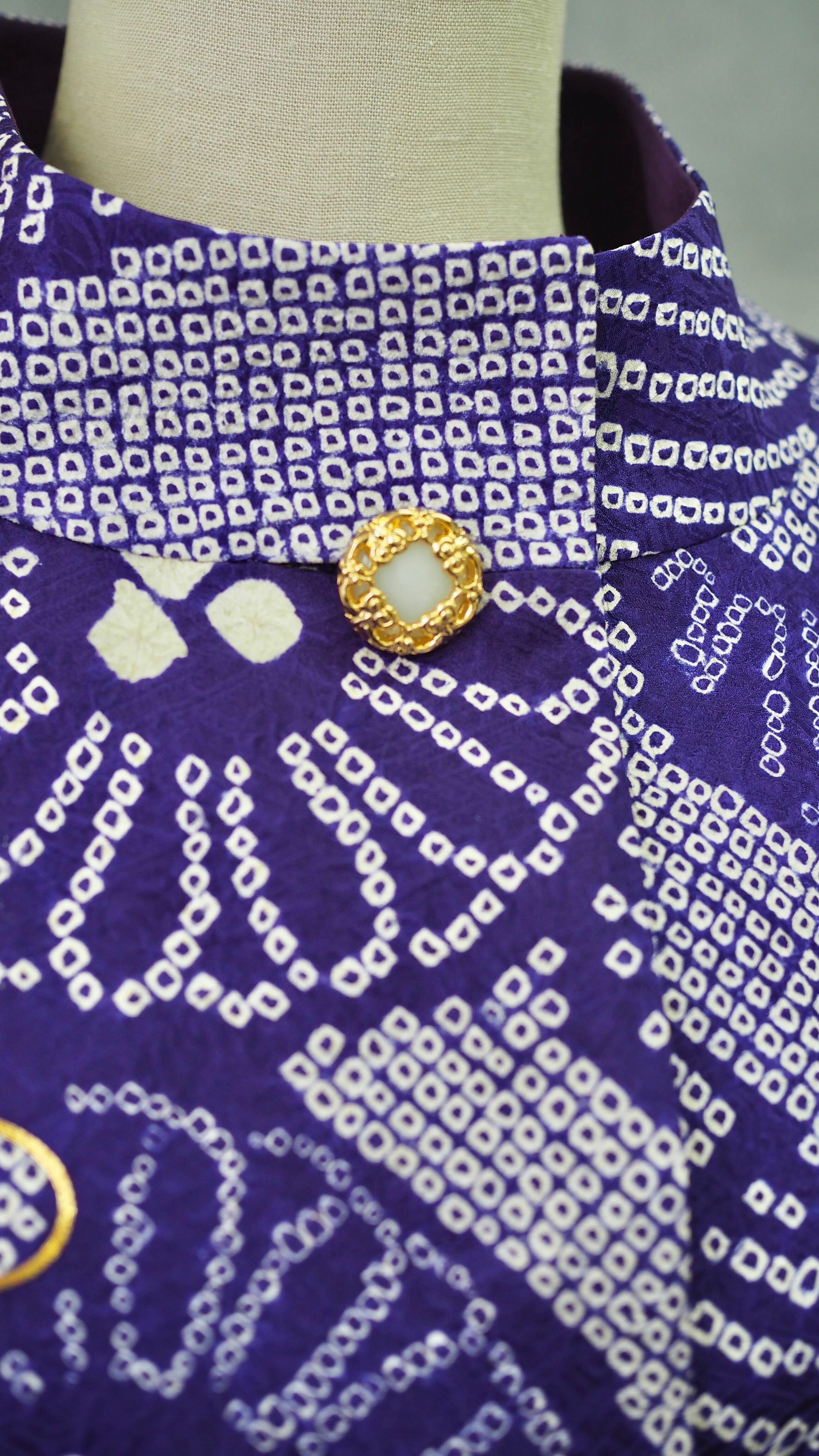 鮮やかな帝王紫の地に、絞り染めによる菊と幾何学文様が全面に広がり、それぞれの文様は染色前に一つ一つ手で結ばれた無数の絞りによって生み出されています。