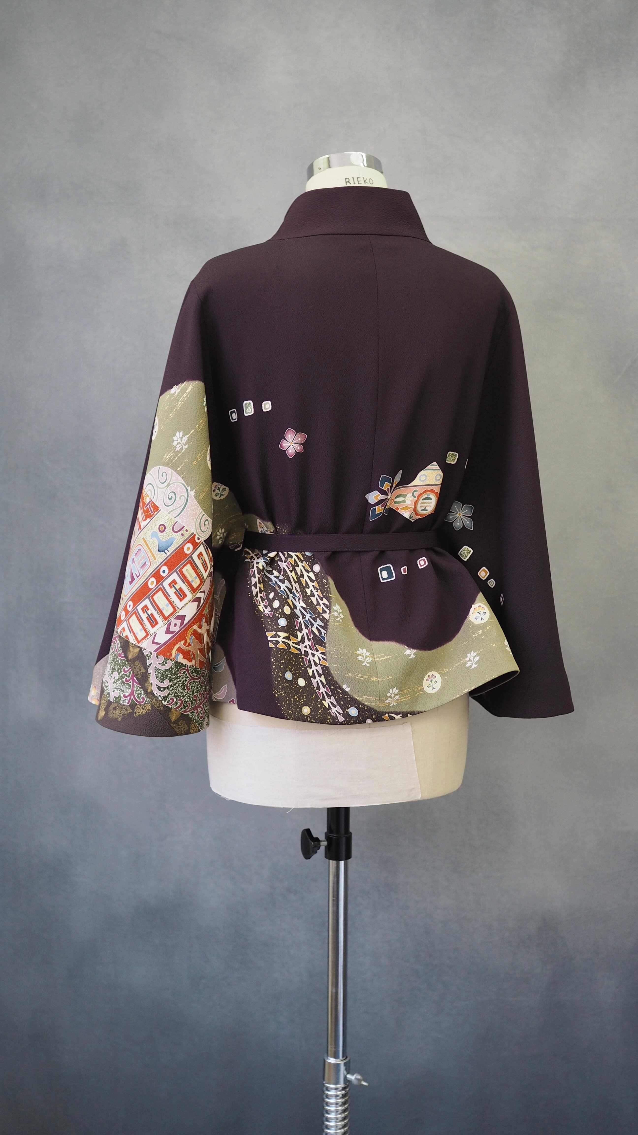 ウエストベルトを前後に通してすっきりとしたシルエットに、前だけ通して背中の美しい柄を際立たせるドラマティックなスタイルに、ベルト無しでゆったりと羽織るリラックススタイルに。